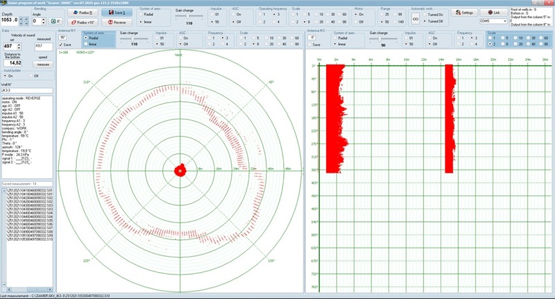 Проводятся различные измерения формы скважины под различными углами и на различных высотах, подбираются оптимальные частоты и мощности сигнала для получения оптимальных результатов измерений. Информация отображается в реальном времени в радиальной или линейной системе координат, по желанию оператора. |